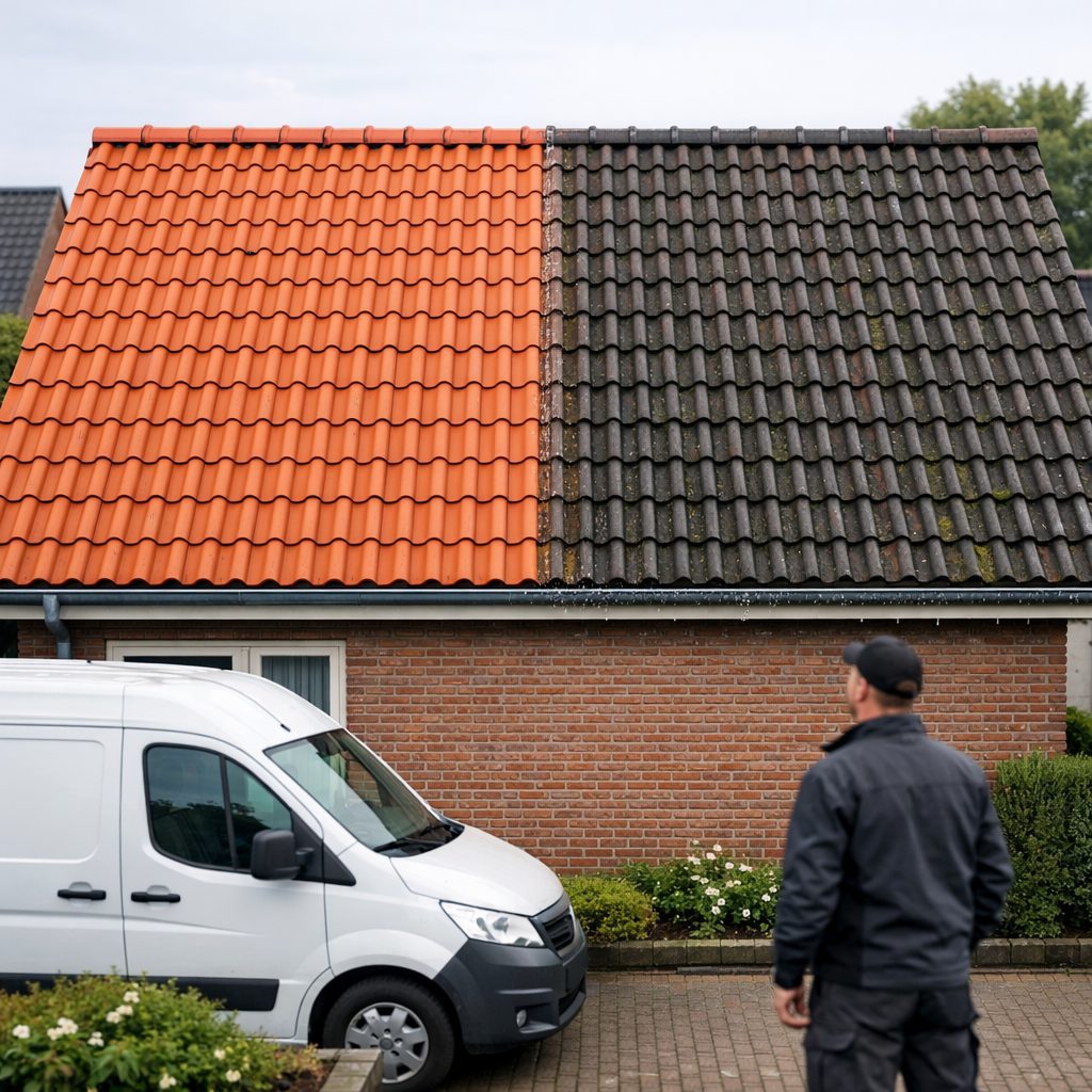 - Mate van vervuiling – Licht vervuild dak is sneller schoon. Bij veel mos op het dak of zwarte aanslag is soms handmatige verwijdering of een intensievere voorbehandeling nodig.
